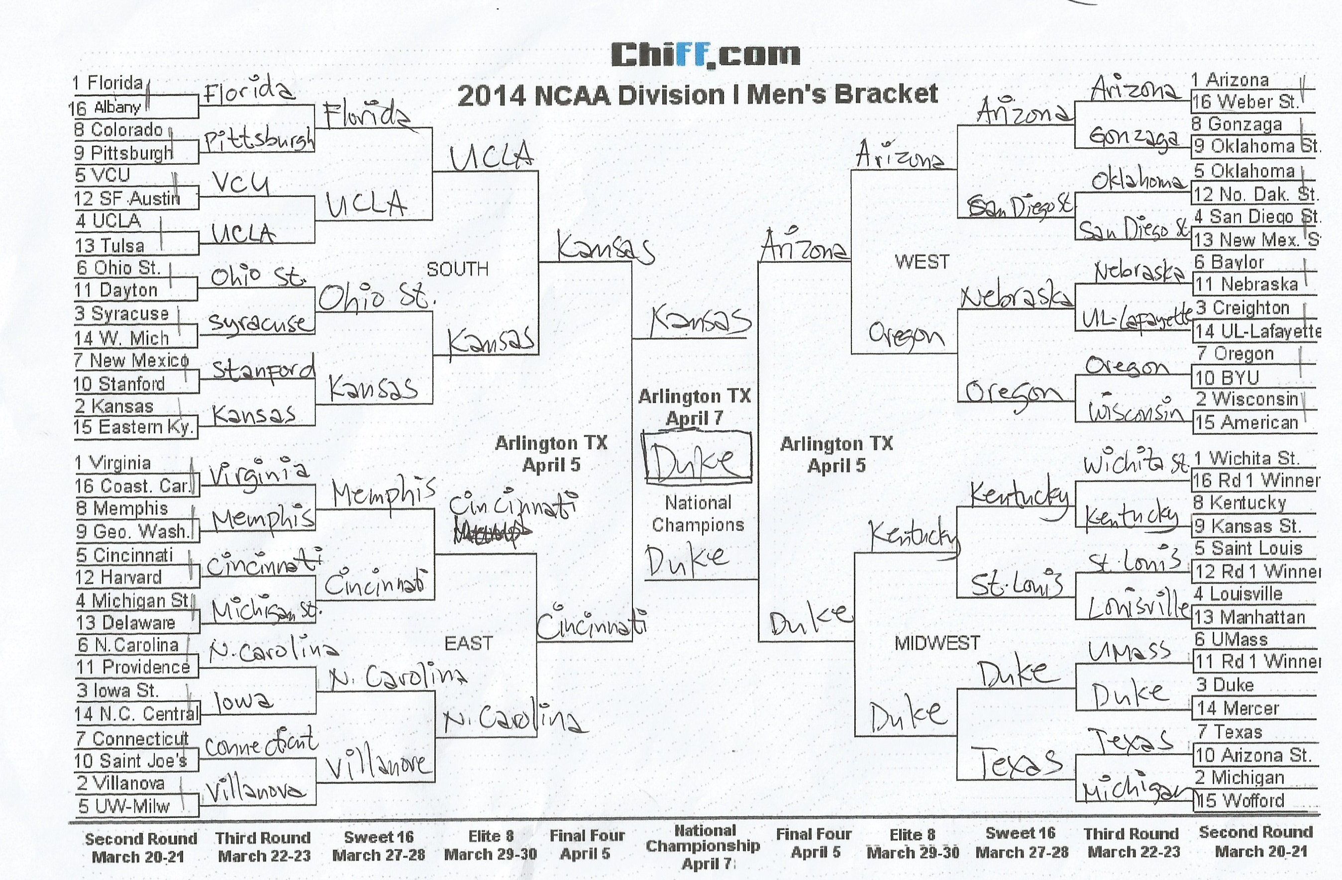 I picked Kansas and Duke to, uhhh, duke it out in the Championship Round because who wouldn’t want to see #FutureLakers Andrew Wiggins, Jabari Parker and Joel Embiid in action? Also, I have Duke to win it all. I’ve been a fan (albeit not as much as I am with the Lakers) of the Blue Devils because of their commitment to basketball and their winning tradition. That’s the main reason why coach Mike Krzyzekwski was selected to head Team USA in the 2008 and 2012 Olympics. Oh, and Kobe said he would’ve gone to Duke if he decided to go to college.