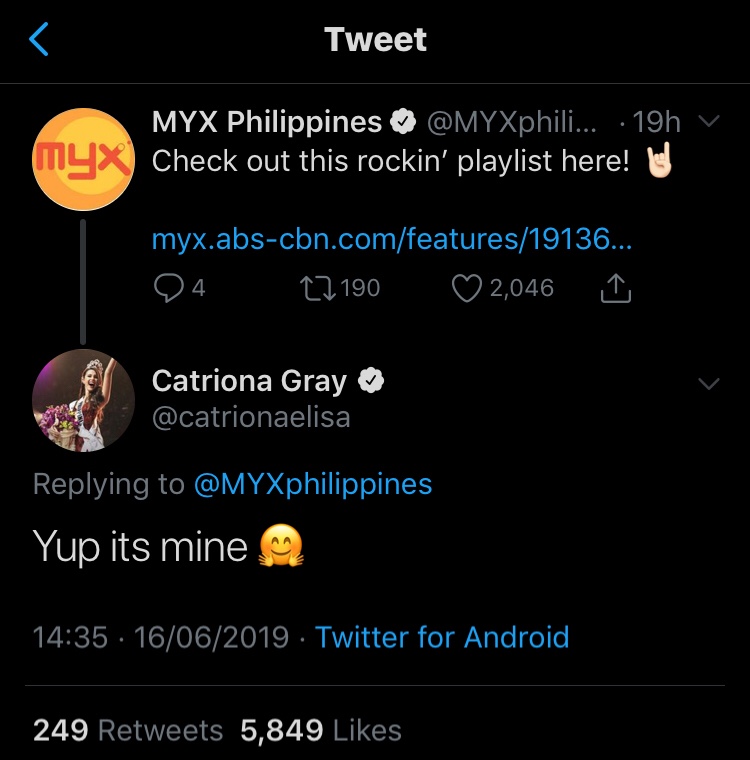 An article on Myx circulated last week about a purported Spotify playlist curated by none other than reigning Miss Universe Catriona Gray, which she has since confirmed on Twitter that it was indeed hers.